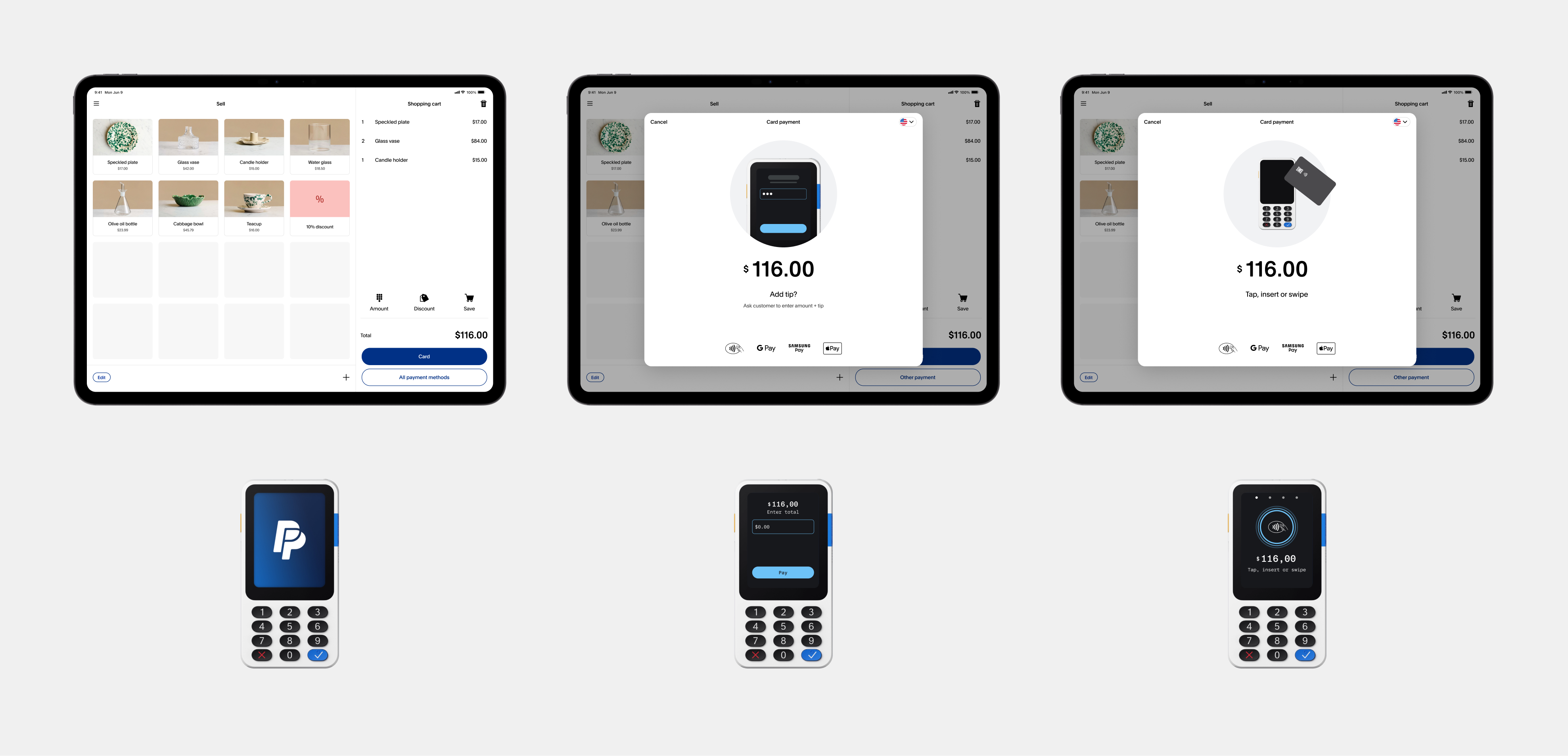 Depending on the market and merchant settings, buyers get an adapted tipping dialogue on the reader and merchants are informed what's happening with text and sounds. This shows the merchant flow, except the accept or decline steps after the card has been used by the buyer.